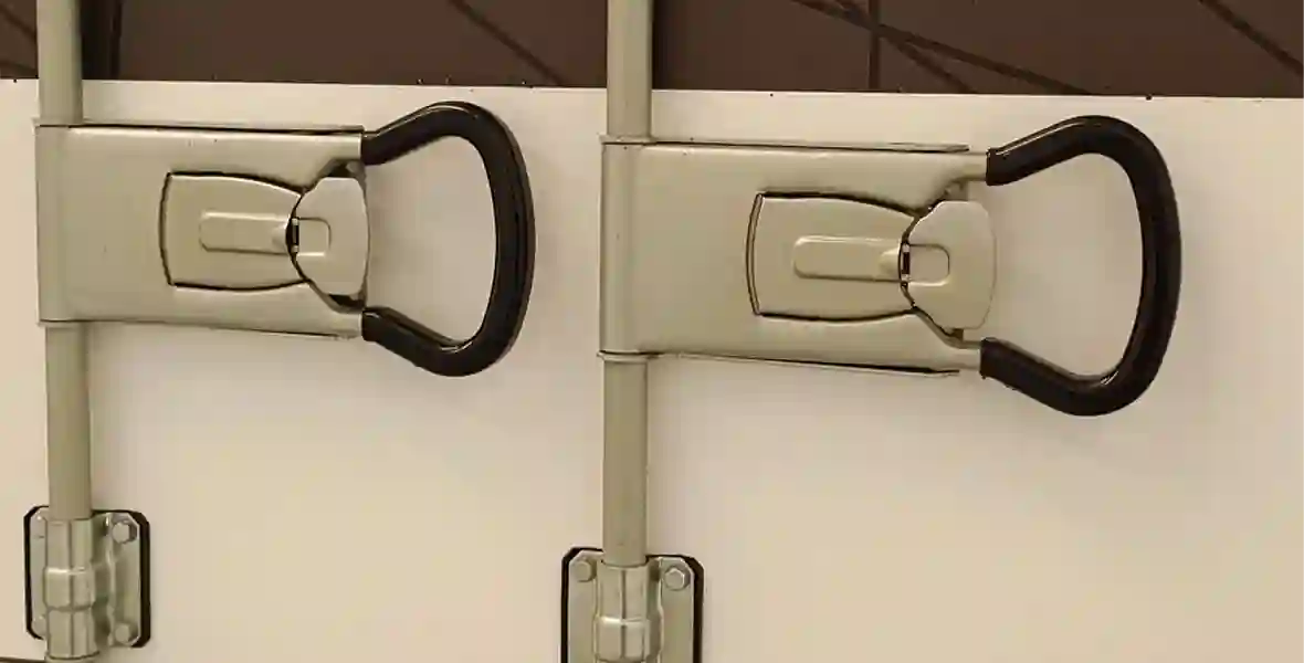 На воротах – штанги с пуш-ручками, петли выполнены из нержавейки. Штанги – из оцинкованной стали. Лестница на всех машинах оцинкованная.